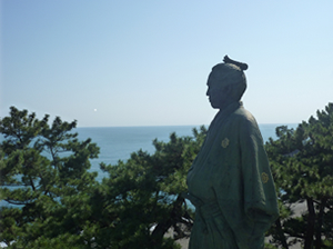 高知県を代表する景勝地の一つ。浦戸湾口、龍頭[りゅうず]岬と龍王岬の間に、弓状にひろがる海岸で、背後に茂り合う松の緑と、海浜の五色の小砂利、紺碧の海が箱庭のように調和する見事な景勝地。古来より月の名所として知られ、“月の名所は桂浜……”と「よさこい節」にも唄われている。
